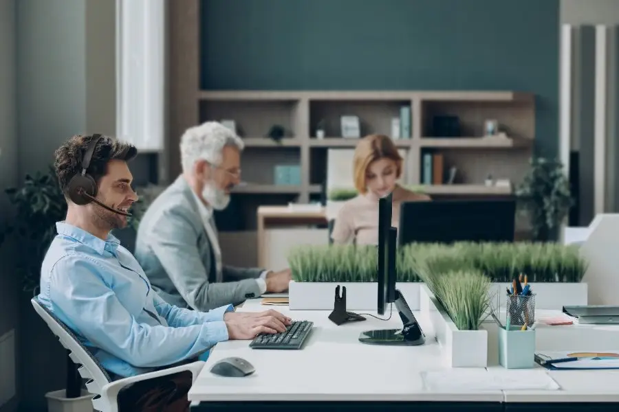 Colleagues chatting. Keyboards clacking. Printers whirring.